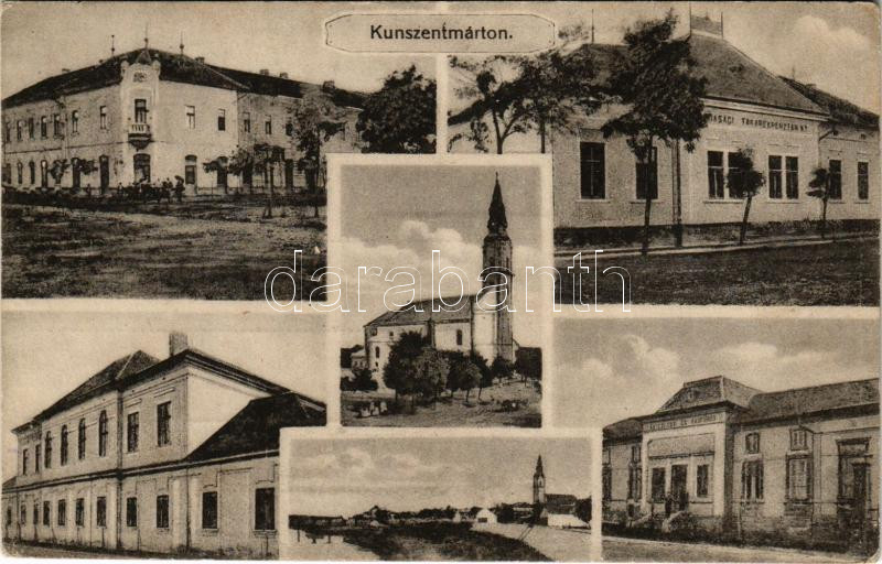 Kunszentmárton, Gazdasági takarékpénztár, templom, Artézi gőz és kádfürdő, Járásbíróság, Körös szálloda (felületi sérülés / surface damage)