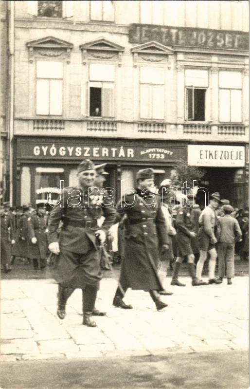 Szombathely, magyar katonák, darutollas cserkészek, Gyógyszertár a Szentlélekhez, Jesztl József üzlete. photo