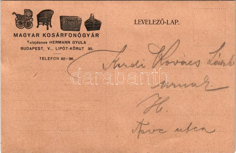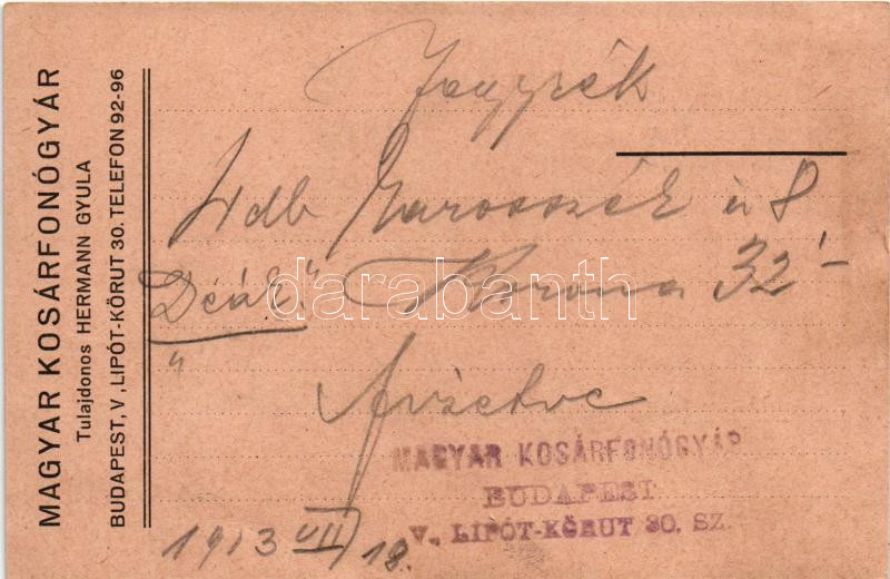 1913 Hermann Gyula Magyar Kosárfonógyár reklámja. Budapest V. Lipót körút 30. / Hungarian basket weaving factory advertising card (gyűrődés / crease)