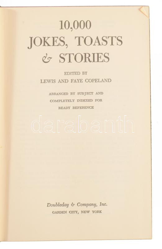 Copeland, Lewis and Faye: 10 000 Jokes, Toasts & Stories. New York, Doubleday & Company. Kiadói kartonált kötés, gerinc sérült, kopottas állapotban.