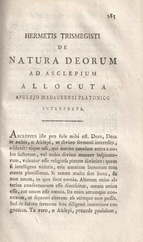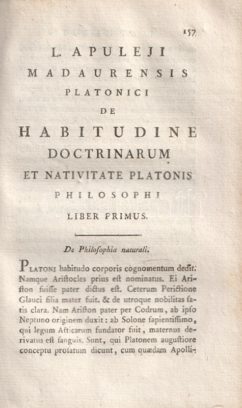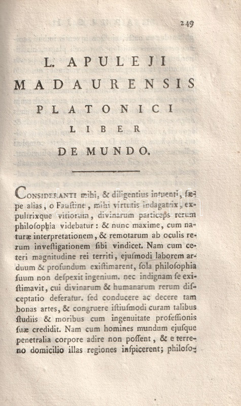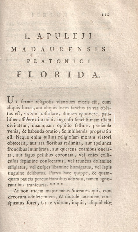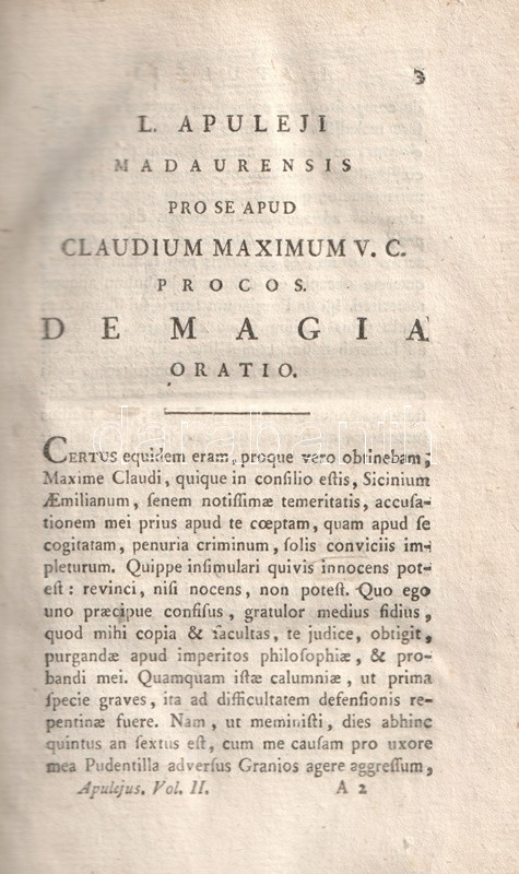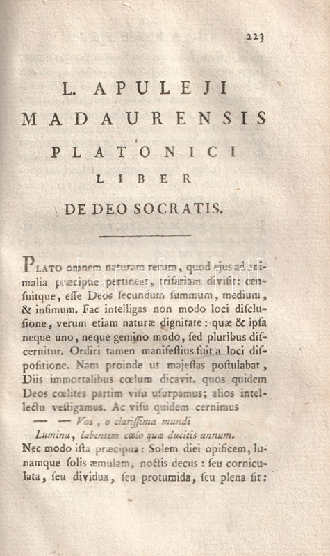 Apulieus (124-170 után) afrikai származású latin író, szónok, műfordító és filozófus. A zweibrückeni Tudós Társaság két kötetben adta ki az ókori gondolkodó műveit, tételünk Apuleius mágiáról, a szókratészi filozófiáról írt értekezéseit és műfordításait adja közre.
