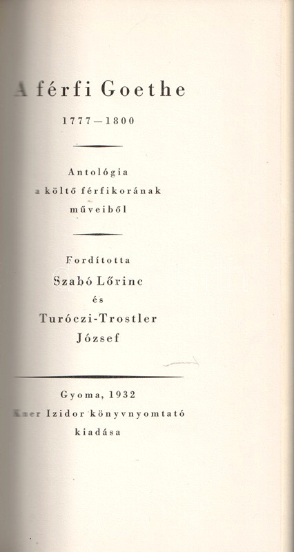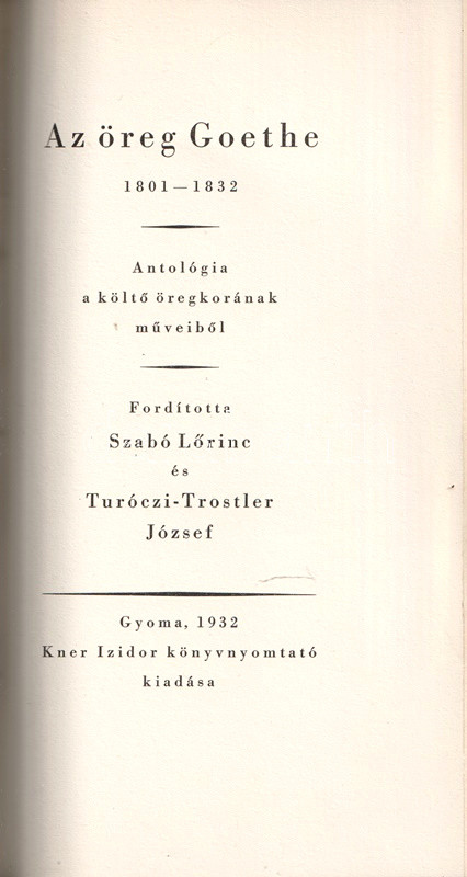 Az örök Goethe. Antológia a költő műveiből. Fordította Szabó Lőrinc és Turóczi-Trostler József. I-III.: Az ifjú Goethe. A férfi Goethe. Az öreg Goethe. [Teljes mű három kötetben, egybekötve.]