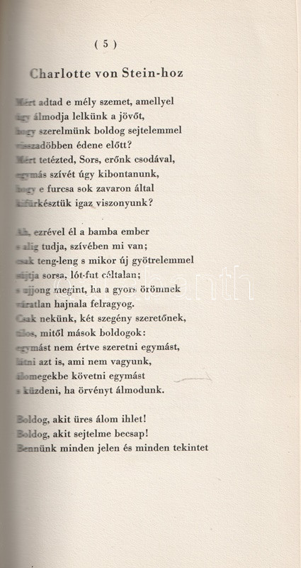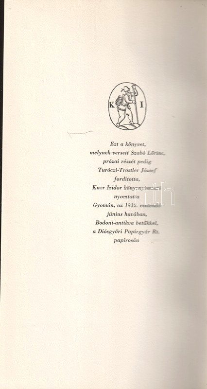 Kolofon: "Ezt a könyvet, melynek verseit Szabó Lőrinc, prózai részét pedig Turóczi-Trostler József fordította, Kner Izidor könyvnyomtató nyomtatta Gyomán, az 1932. esztendő június havában, Bodoni antikva betűkkel, a Diósgyőri Papírgyár Rt. papirosán".