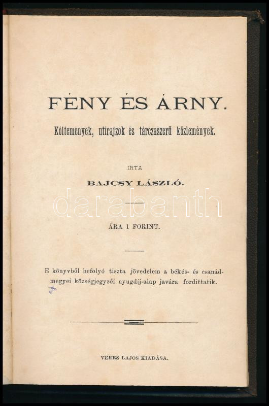 Bajcsy László: Fény és árny. Költemények, útirajzok és tárcaszerű közlemények. H.n., é.n., Veres Lajos. Egészvászon kötés, utolsó lap kijár, kissé kopottas állapotban.