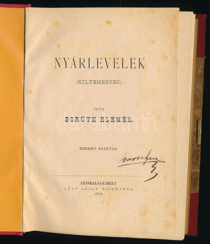 Borúth Elemér: Nyárlevelek. (Költemények.) Sátoraljaújhely, 1878, szerző (,,Zemplén"-ny.), [4]+278+[4] p. Egyetlen kiadás. Félvászon-kötésben, kissé foltos borítóval, néhány kissé foltos lappal. A címlapon szentkirályszabadjai Karsa Ferenc (1827-1915) 1848-as honvéd hadnagy, Görgey Artúr parancsőrtisztje, árvaszéki elnök névbejegyzésével. Ritka!