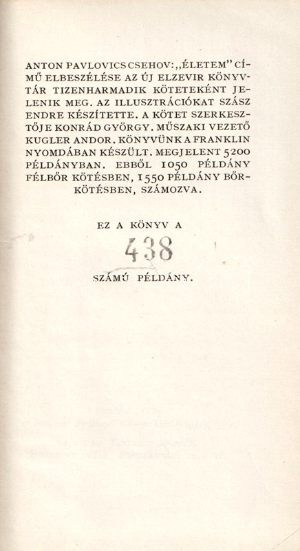 Könyvgyűjtők számára készült, számozott, bibliofil kiadás. Kolofon: "Anton Pavlovics Csehov: "Életem" című elbeszélése az Új Elzevir könyvtár tizenharmadik köteteként jelenik meg. Az illusztrációkat Szász Endre készítette. A kötet szerkesztője Konrád György. Műszaki vezető Kugler Andor. Megjelent 5200 példányban, ebből 1050 példány félbőr kötésben, 1550 bőrkötésben, számozva. Ez a könyv a 438. számú példány."