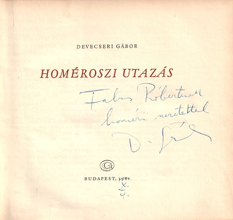 Dedikált: "Falus Róbertnek homéri szeretettel. D. Gábor. 1961. X/4".
