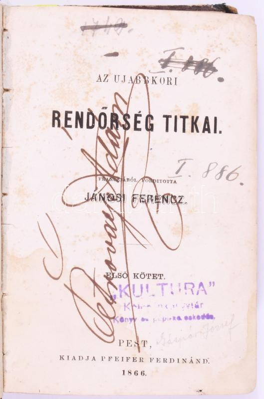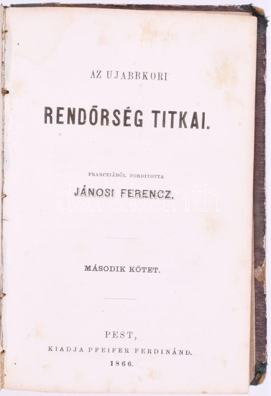Jánosi Ferenc: Az ujabbkori rendőrség titkai. Franciából ford.: - - . I-II. köt. [Egybekötve.] Pest, 1866, Pfeifer Ferdinánd, [4]+175 p.; [4]+153+[1] p. Egyetlen kiadás. Félvászon-kötésben, kopott, kissé sérült borítóval és gerinccel, foltos lapokkal, tulajdonosi névbejegyzéssel (Petrovay Ádám).
