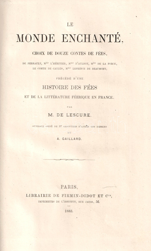 Le monde enchanté. Choix de douze contes de fées de Perrault, L'Héritier, D'Aulnoy, De La Force, De Caylus, Leprince de Beaumont. Prédécé d'une histoire des fées et de la littérature féerique en France par M. De Lescure. Ouvrage orné de 37 gravures d'apres les dessins de A. Gaillard.