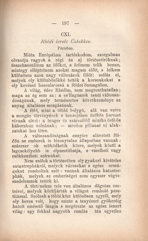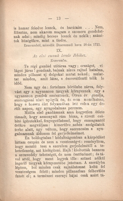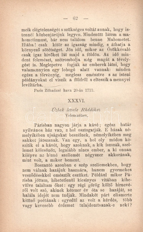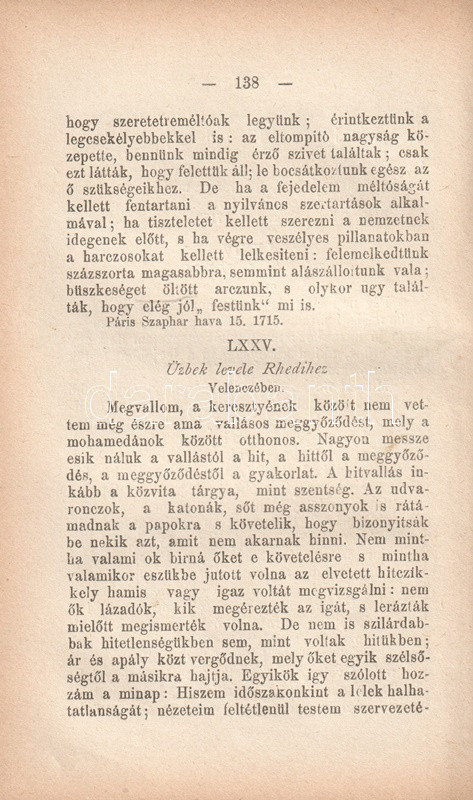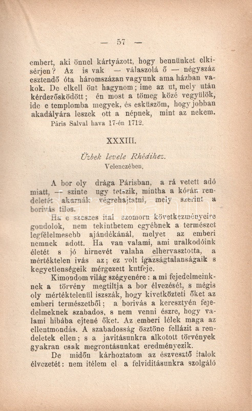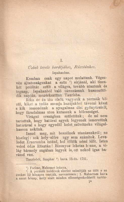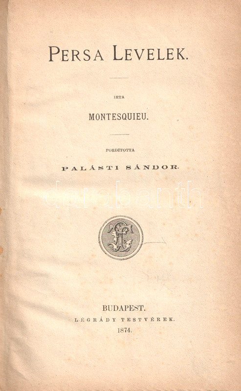 Charles-Louis de Montesquieu (1689-1755), ügyvéd, Ãró, filozófus, enciklopédista, a francia felvilágosodás államelméleti gondolkodója. Szűkebb körökben szép szakmai sikert jelentÅ‘ orvos- és politikatörténeti Ãrásai után 1721-ben ismerte meg nevét a szélesebb olvasóközönség. "Lettres persanes" (Perzsa levelek) cÃmen Ãrt szatirikus levélregénye görbe tükröt tart kora társadalmának abszurditásai elé. Montesquieu magyar fordÃtása történelmi és államelméleti Ãrásainak átültetésével kezdÅ‘dött (1808, 1833), tételünk a szatirikus regény elsÅ‘ teljes magyar kiadásából származik.
