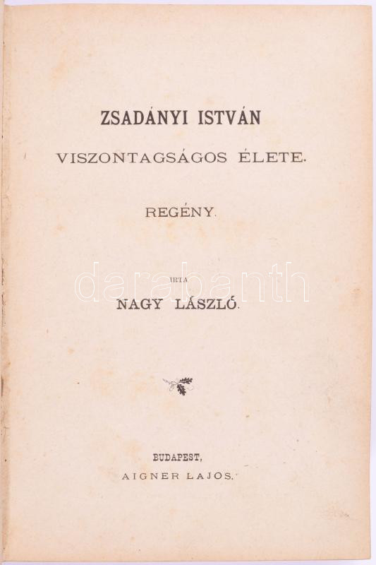 Nagy László: Zsadányi István viszontagságos élete. Regény. I-II. köt. Bp., [1881], Aigner Lajos, 528 p.; 419+[1] p. Egyetlen kiadás. Félvászon-kötésben, nagyrészt jó állapotban, kissé kopottas borítóval, helyenként kissé foltos lapokkal. Ritka!