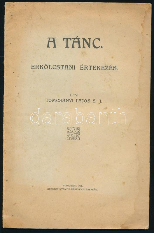 Tomcsányi Lajos: A tánc. Erkölcstani értekezés. Bp., 1914, Apostol-ny., 31+(1) p. Kiadói tűzött papírkötés, foltos borítóval, néhány foltos oldallal.