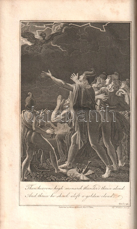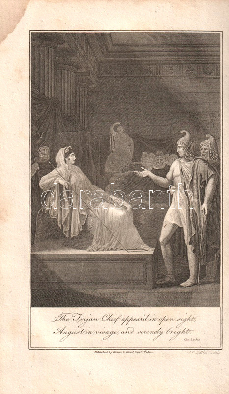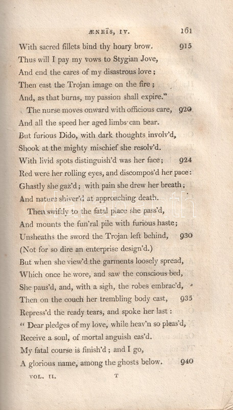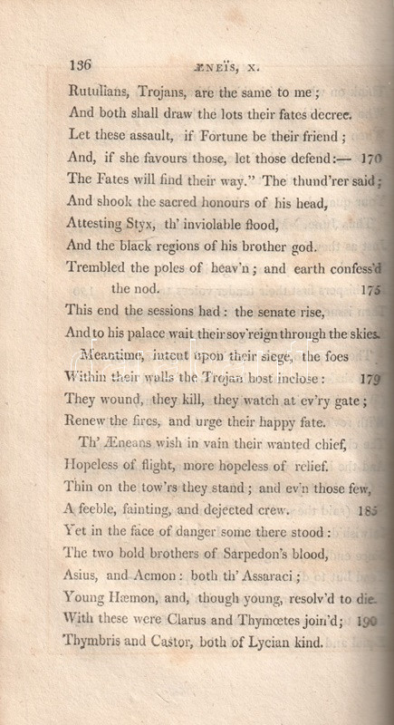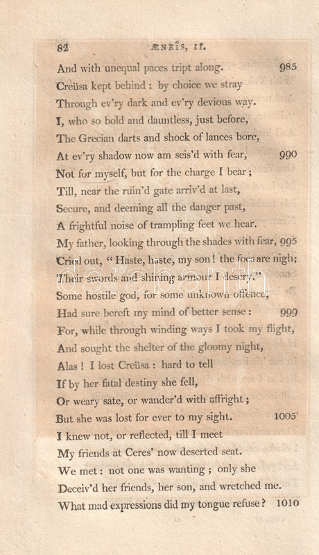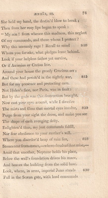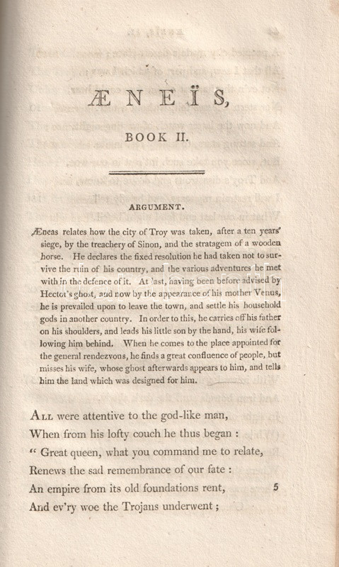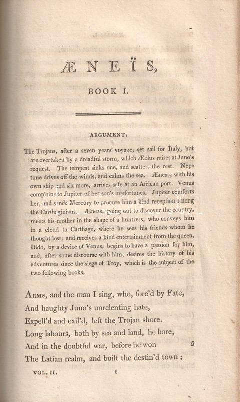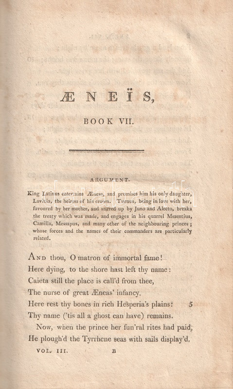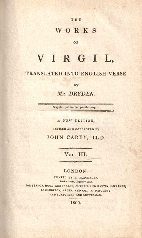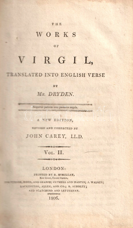 Vergilius műveit John Dryden (1631-1700) koszorús angol költő, dráma- és szatíraíró, kritikus és műfordító fordította angol nyelvre, kora szokásainak megfelelően a hexameteres formát az angol költészeti hagyományokhoz igazodó, rímes jambikus formában. Az először 1697-ben kiadott, Dryden-féle Vergilius-kiadás jelentős bevételt hozott fordítója számára, a munkát számos alkalommal kiadták: 1806-ban párhuzamosan több kiadó is. Példányunk a Vernor, Hood and Sharpe kiadó háromkötetes változatából való, melynek első kötete Vergilius pásztori költészetét és Georgikonját, a tételünket alkotó második és harmadik kötete az Aeneis tizenkét énekét tartalmazza, a hozzá tartozó, míves rézmetszetek kíséretében.