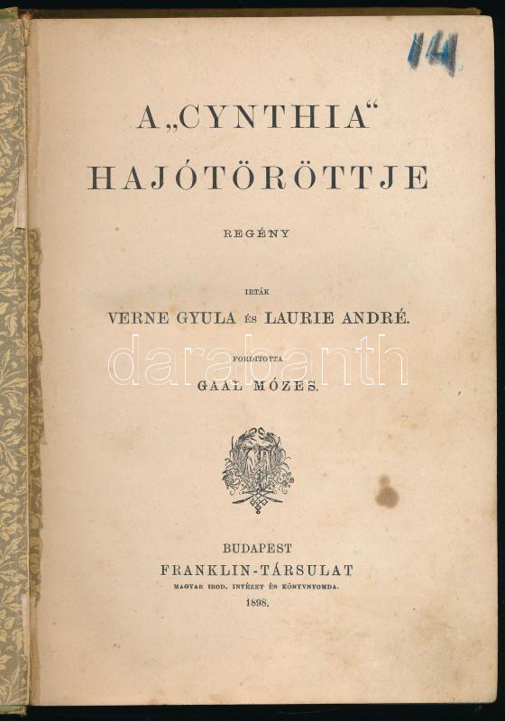 Verne Gyula - Laurie André: A ,,Cynthia" hajótöröttje. Ford.: Gaal Mózes. Bp., 1898, Franklin-Társulat, 185+[7] p. Kiadói egészvászon-kötés, viseltes borítóval, helyenként kissé foltos lapokkal, hiányzó elülső szennylappal.