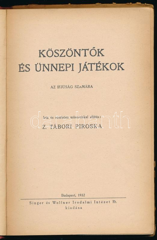 Z. Tábori Piroska: Köszöntők és ünnepi játékok. Bp., 1932, Singer és Wolfner. Félvászon kötés, kopottas állapotban.