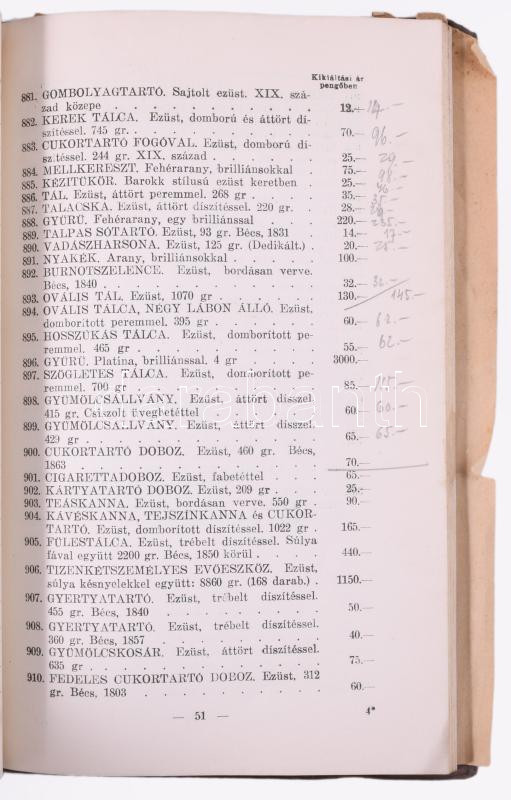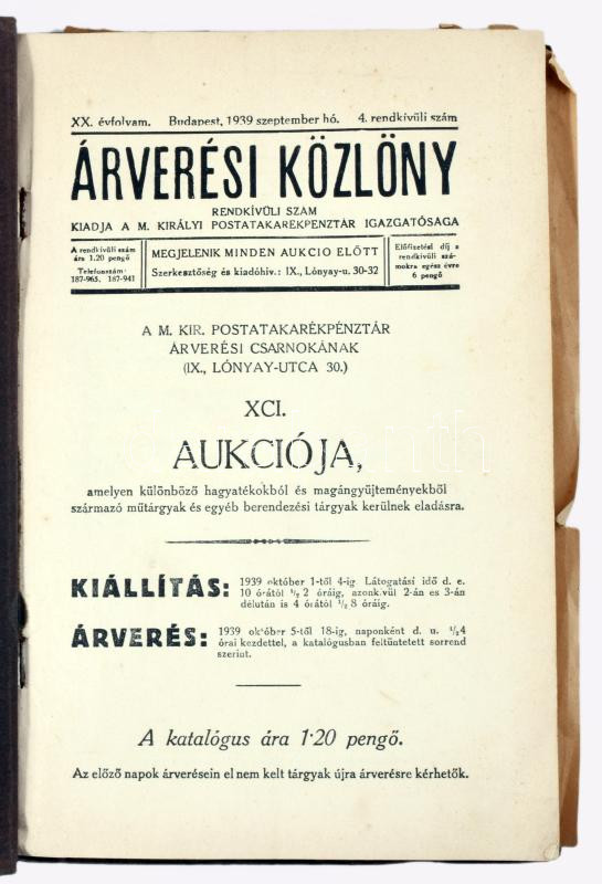 Árverési közlöny. A m. kir. postatakarékpénztár árverési csarnokának 1939 szeptemberi XCI aukciója rendkívüli szám 111 p . XVIII t.