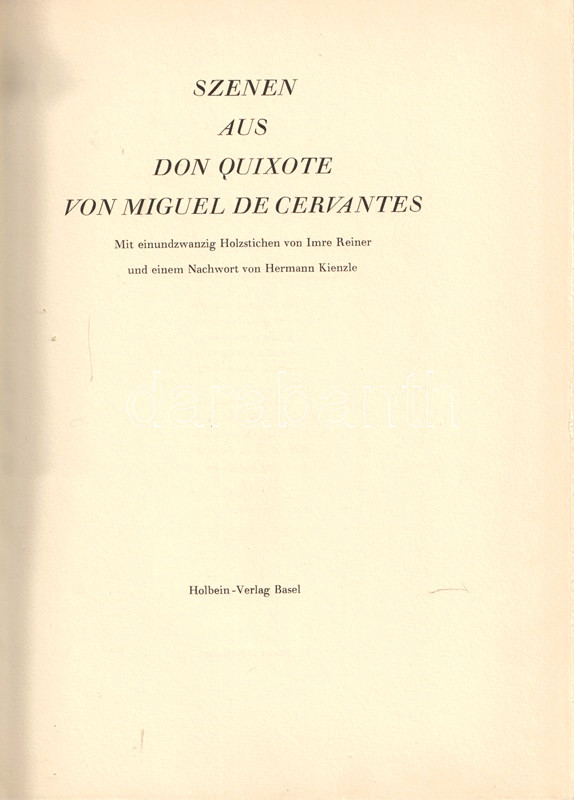 Reiner Imre (1900-1987) magyar származású svájci betűmetsző, tipográfus, grafikusművész és illusztrátor. Számos klasszikus irodalmi mű jelent meg illusztrációival, Cervantes-regénykivonatunk esetén a művész 21 rajzával.