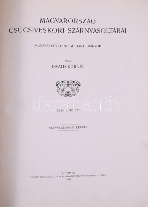 Divald Kornél: Magyarország csúcsiveskori szárnyasoltárai. Művészettörténelmi tanulmányok. I-II. köt. [Egybekötve.] Bp., 1909-1911, Pátria-ny., 27+[1] p.; 55+[1] p. Fekete-fehér képekkel illusztrálva. Félvászon-kötésben, nagyrészt jó állapotban, egy-két sérült lappal.