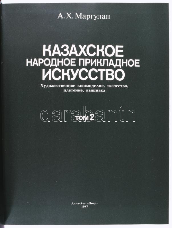 Margulan, A. Kh.: Kazakhskoe narodnoe prikladnoe iskusstvo. Tom 2. [Kazah népi iparművészet. 2. köt.] Almati, 1987, Izdatelstvo Fner. Gazdag képanyaggal illusztrálva. Orosz nyelven. Kiadói egészvászon-kötés, koszos borítóval, kiadói papír védőborítóban.