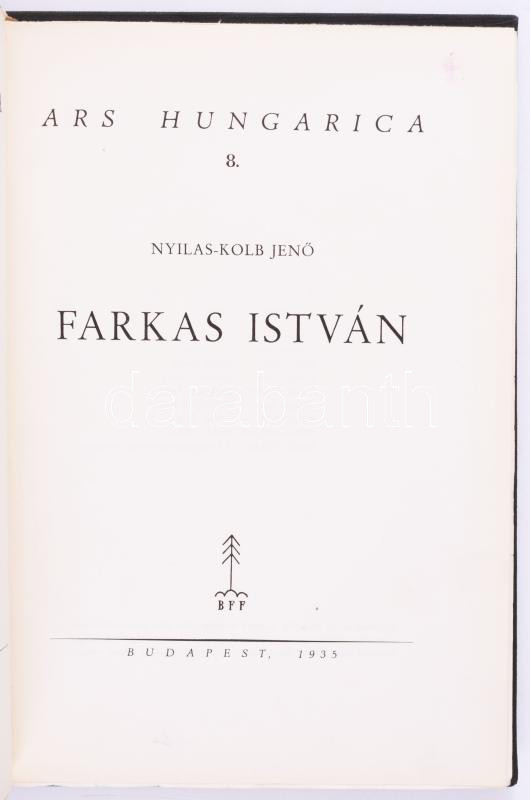 Nyilas-Kolb Jenő: Farkas István. Ars Hungarica 8. Bp., 1935, Bisztrai Farkas Ferencz, 1 (címkép) t.+ 30+[2] p. + 32 t. (reprodukciók). Egyetlen kiadás. Kiadói egészvászon-kötés, kissé viseltes borítóval, sérült gerinccel.