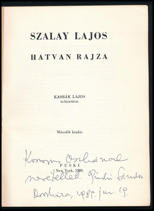 Szalay Lajos hatvan rajza. Kassák Lajos előszavával. Püski Sándor által DEDIKÁLT! New York, 1980, Püski. Kiadói papírkötés, jó állapotban.