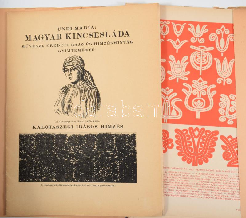 Undi Mária: Magyar kincsesláda. Művészi, eredeti rajz- és hímzésminták gyűjteménye. III. füzet: Kalotaszegi írásos hímzés. + VIII. füzet: Dunántúli lyukacsos- és telehímzés. Bp., é.n. (cca 1930-1940), szerző, [6] p.+ 13 t.; [8] p.+ 16 t. Kiadói papírborítóban, az egyik füzet sérült borítóval.