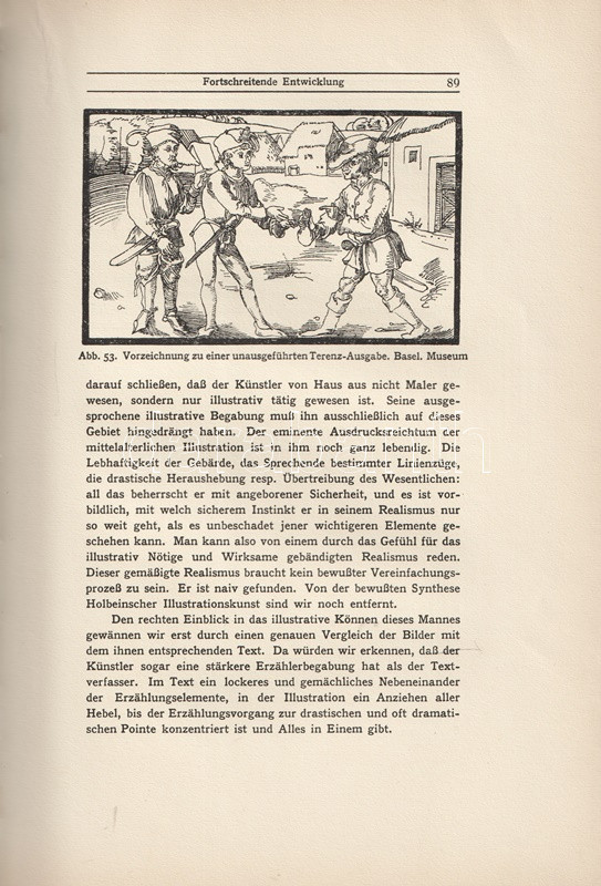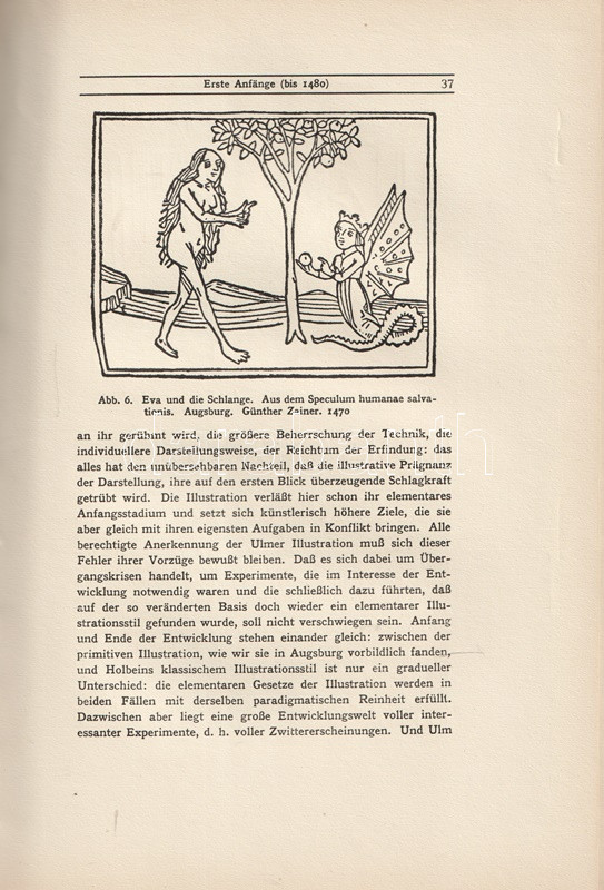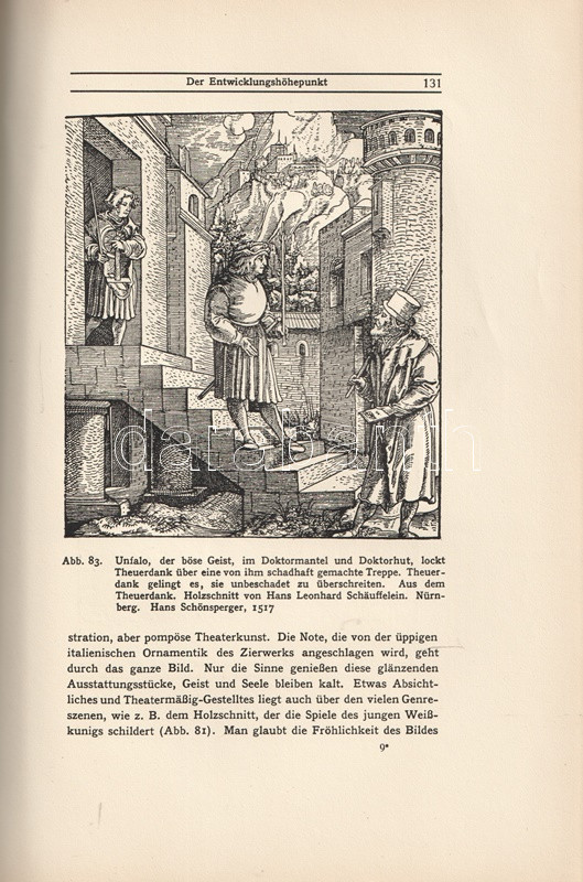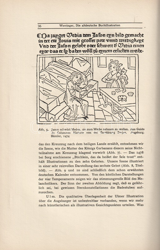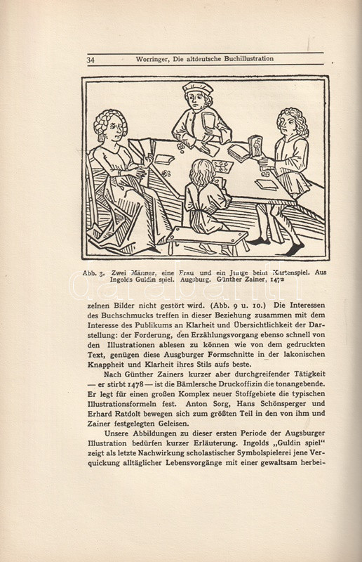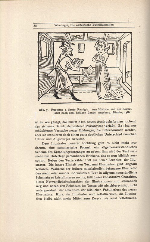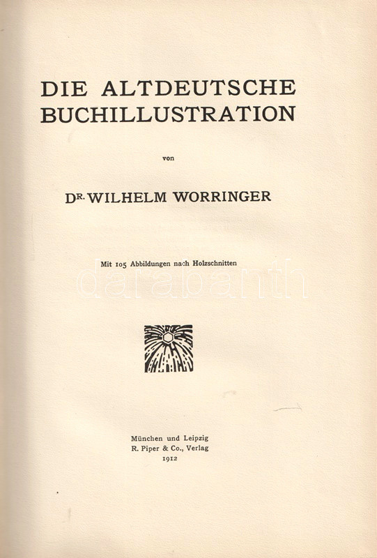 Wilhelm Worringer (1881-1965) német művészettörténész, az absztrakciót szabadon engedő, realista elvárásoknak nem engedelmeskedő avantgárd képzőművészet és a nem kevésbé absztrakcióra törekvő késő gótika szakértője. Szövegközti és egész oldalas fametszetekkel gazdagon illusztrált monográfiájában a német késő gótikus grafika humoros-groteszk és áhítatos kompozíciói egyaránt felvonulnak.