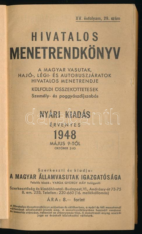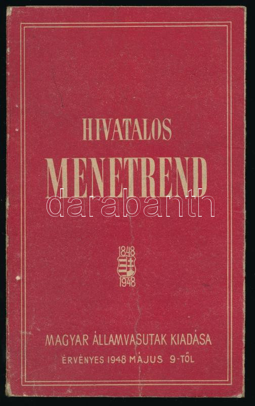 1948 Hivatalos Menetrendkönyv. A magyar vasutak, hajó-, légi- és autobuszjáratok hivatalos menetrendje. Külföldi összeköttetések. Személy- és poggyászdíjszabás. Szerk. és kiadja: a Magyar Államvasutak igazgatósága. Bp., 1948, Athenaeum-ny., 400 p. Kiadói papírkötés, kissé viseltes borítóval.