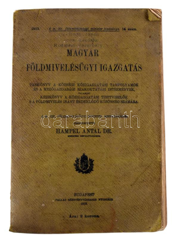 Hampel Antal (szerk.): Magyar földmivelésügyi igazgatás. A m. kir. földmívelésügyi minister kiadványai 1913. 14. sz. Bp., 1913, Pallas-ny., VIII+883+[1] p. Kiadói papírkötés, kissé viseltes állapotban, a könyv elején a fűzéstől elváló lapokkal.