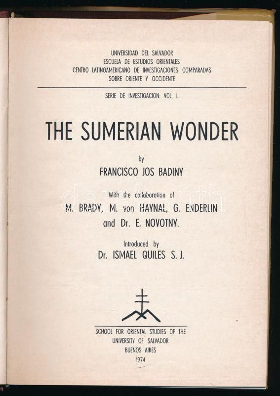 Badiny, Francisco Jos: The Sumerian Wonder. Buenos Aires, 1974, School for Oriental Studies of the University of Salvador. Emigráns kiadás. Kiadói egészvászon kötés, ragasztott papír védőborítóval.