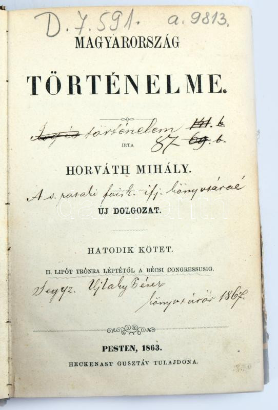 Dr. Horváth Mihály: Magyarország történelme 6. kötet. Pest, 1863, Heckenast Gusztáv, 422+1 p. Új dolgozat. Korabeli sérült félbőr kötésben