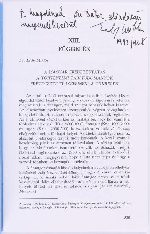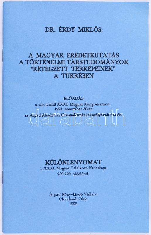 Érdy Miklós: A magyar eredetkutatás a történelmi társtudományok "rétegezett térképeinek" a tükrében. Különlenyomat a XXXI. Magyar Találkozó Krónikája 239-270. oldaláról. A szerző, Érdy Miklós (1931-2017) orientalista kutató, vegyészmérnök, fogorvos által gróf Tisza Istvánné Gyányi Magdolna részére dedikált példány. Cleveland, 1992, Árpád Könyvkiadó, 239-270 p. Kiadói tűzött papírkötés.