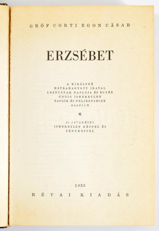 Gróf Corti Egon Cäsar: Erzsébet. A királyné hátrahagyott iratai, leányának naplója és egyéb eddig ismeretlen naplók és feljegyzések alapján. Bp., 1989, Szépirodalmi Könyvkiadó. Reprint kiadás. Kiadói kartonált papírkötés, sérült kiadói papír védőborítóban. Az 1935-ös Révai-kiadás hasonmása.