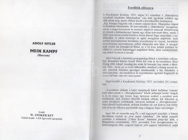 Hitler, Adolf: Mein Kampf. (Harcom). Történelmi dokumentumok. [Gyöngyös, 1998 körül], W. Stoker Kft. 496 p. A nemzetiszocialista vezető egyetlen, még életében kiadott könyve, melyet landsbergi fogsága idején kezdett el írni, miután 1923-ban az ún. sörpuccsban való részvételéért börtönbe zárták. A könyvben áttekintette addigi pályafutását és megfogalmazta világnézetét, valamint politikai programját. A mű a nácizmus ideológiai alapvetése lett. Hitler ezzel az írással egy átfogó elméletet kívánt a nép elé állítani a marxizmus ellenében. Emellett úgy kívánta bemutatni addigi pályáját, mint ami pártja és az egész nép ideális vezetőjévé teszi őt a zsidóság, mint közös ellenség elleni összefogásban. Megerősítette az NSDAP 25 pontos programjának érvényességét. Megállapította, hogy a nemzeti szocializmus egyik elődjének számító völkisch mozgalom sikertelen maradt és ideje lejárt; ezzel szemben az NSDAP modern, céltudatos gyűjtőmozgalommá vált, amely sikerrel tömörítheti a weimari köztársaság nacionalista és antidemokratikus erőit. Fűzve, színes, Hitler portréjával illusztrált kiadói borítóban.