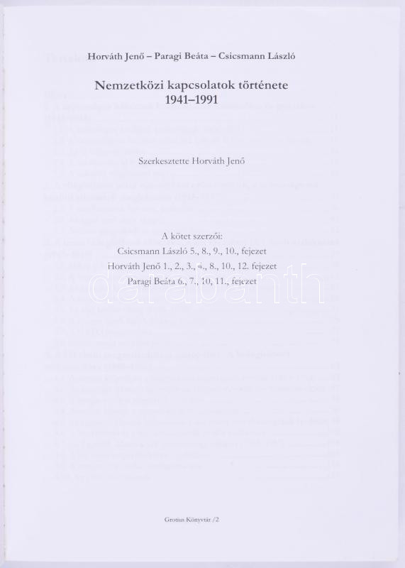 Horváth Jenő - Paragi Beáta - Csicsmann László: Nemzetközi kapcsolatok története 1941-1991. Grotius Könyvtár 2. Veszprém, 2010, Pannonprint Kft. Második, javított kiadás. Kiadói papírkötés, kissé kopott borítóval.