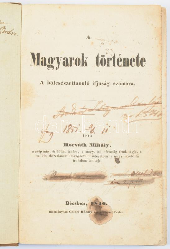 Horváth Mihály: A magyarok története. A bölcsészettanuló ifjúság számára. Bécs-Pest, 1846, Geibel Károly, VIII+444+[2] p. Kiadói egészvászon-kötés, kissé viseltes állapotban, tulajdonosi bejegyzésekkel, helyeként foltos lapokkal, néhány kijáró lappal.