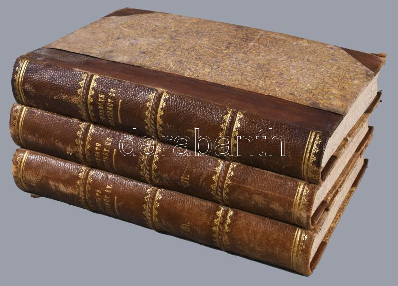 az I. kötet hátsó borítója foltos, és a táblán a papírborítás szakadt, valamint a hátsó tábla vetemedett, a 3. kötet gerincének alján a bőr kissé hiányos, de belül alapvetően jó állapotban.