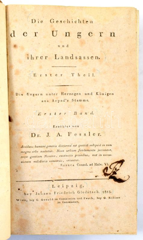 [Ignaz Aurelius Fessler/Fesserl Ignác Aurél (1756-1839)] J. A. Fesserl: Die Geschichte der Ungern und ihrer Landsassen. Erster Theil: Die Ungern unter Herzogen und Königen aus Arpad's Stamme. Erster Band. Erzählet von Dr. - -.