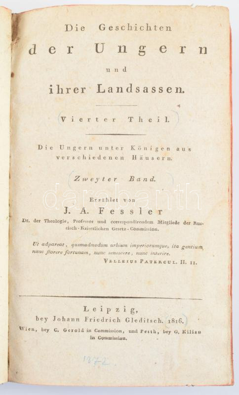 [Ignaz Aurelius Fessler/Fesserl Ignác Aurél (1756-1839)] J. A. Fesserl: Die Geschichte der Ungern und ihrer Landsassen. Vierter Theil: Die Ungern unter Königen aus verschiedenen Häusern. Zweyter Band. Erzählet von - -.