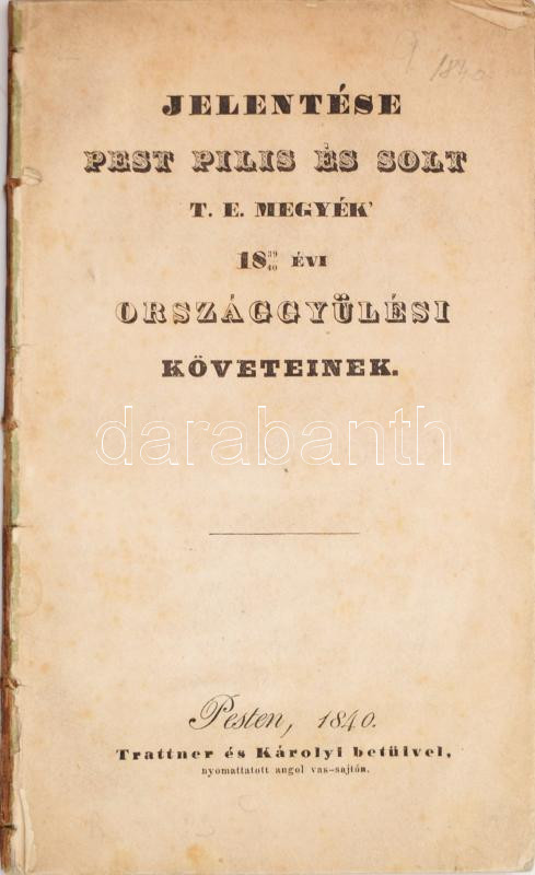 Jelentése Pest Pilis és Solt t. e. megyék 1839/40 évi országgyülési kö... https://www.darabanth.com/de/518-Auktion-Philatelie-Postkarten-Numismatik-Kunstwerke-Bucher-Schreibwaren-Schmuck/524.0/Bucher/Bucher-Geschichte~120/Jelentese-Pest-Pilis-es-Solt-t-e-megyek-183940-evi-orszaggyulesi-koveteinekPest-1840-Trattner~II3514594