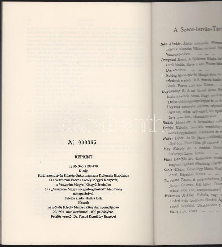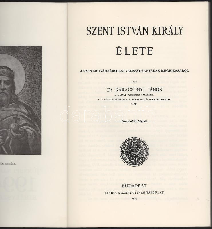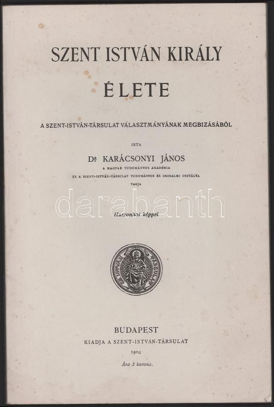 Karácsonyi János: Szent István Király élete. Királyszentistván-Veszprém, 1994, Királyszentistván Község Önkormányzata Kulturális Bizottsága - Eötvös Károly Megyei Könyvtár. Számozott (365./1000) példány. Reprint! Kiadói papírkötés.