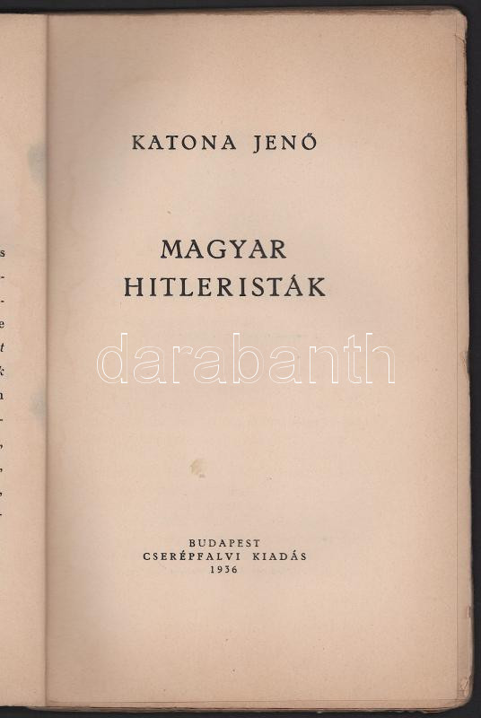 Katona Jenő: Magyar hitleristák. Bp., 1936, Cserépfalvi, 99+1 p. Kiadói papírkötés, kopott borítóval, sérült gerinccel, szakadozott borítószélekkel.