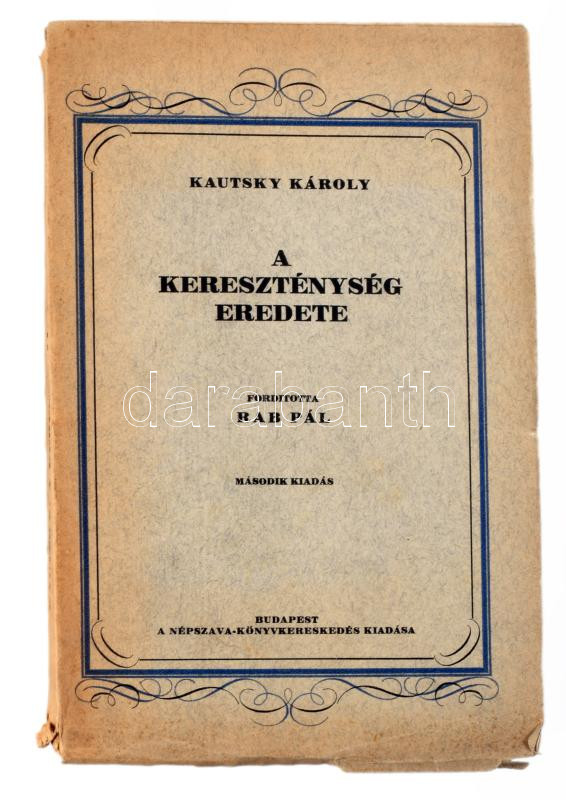 Kautsky Károly: A kereszténység eredete. Ford.: Rab Pál. Bp.,én,Népszava, 383+1 p. 2. kiadás. Kiadói papírkötés, szakadt borítóval, kissé sérült gerinccel.