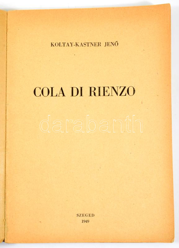 Koltay-Kastner Jenő: Cola di Rienzo. Szeged, 1949. Kiadói papírkötés, kopottas állapotban.