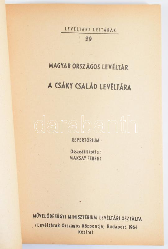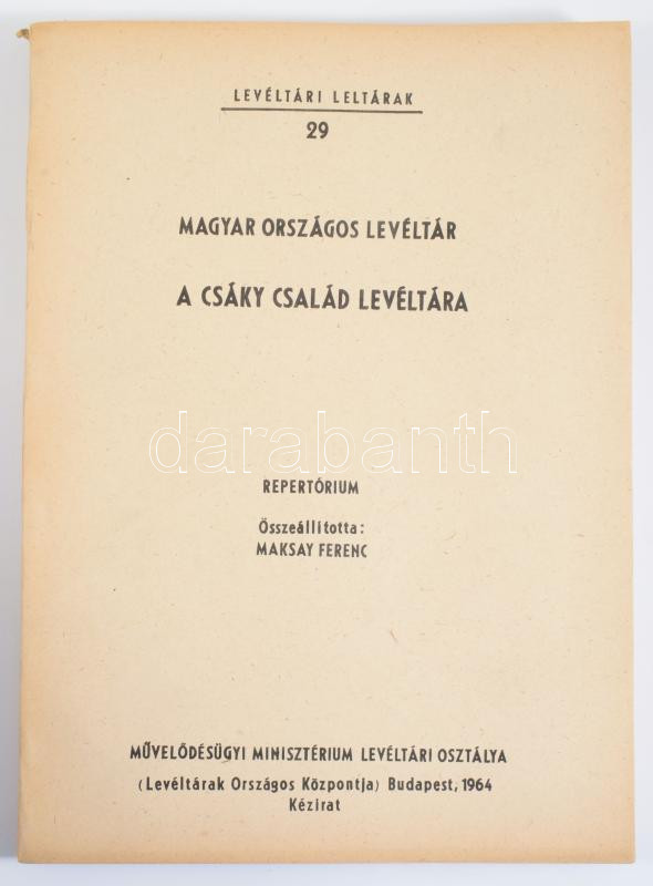 Maksay Ferenc: A Csáky Család Levéltára. Bp., 1964, Magyar Országos Levéltár. Kiadói papírkötés.