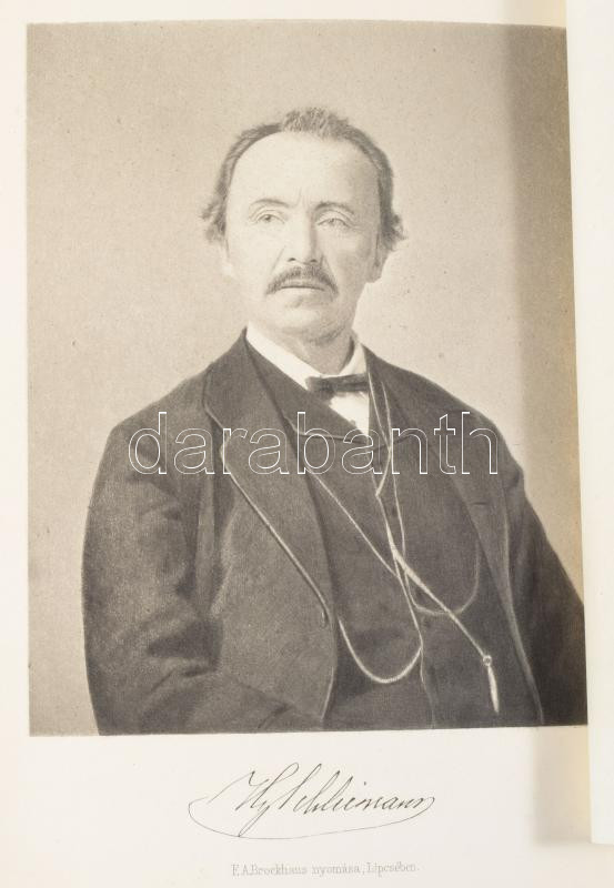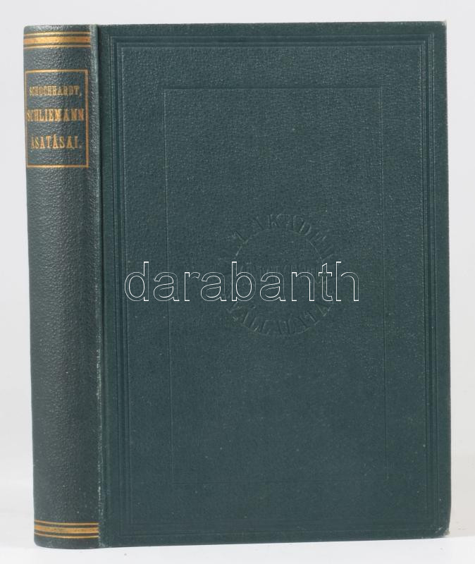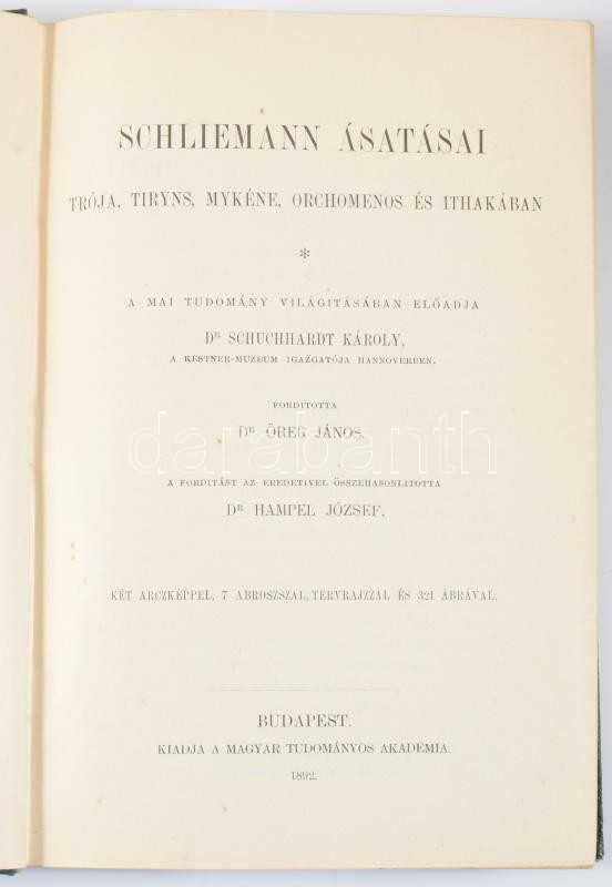 Schuchhardt, [Karl] Károly: Schliemann ásatásai Trója, Tiryns, Mykéne, Orchomenos és Ithakában. Ford.: Öreg János. Bp., 1892, MTA, 1 t.+ VIII+464 p.+ VII (térképek) t.+ 1 t. Egyetlen magyar kiadás. Gazdag fekete-fehér képanyaggal illusztrálva. Kiadói aranyozott egészvászon-kötés, nagyrészt jó állapotban, a lapok egy részén kis foltokkal, a kihajtható táblákon kisebb szakadásokkal.
