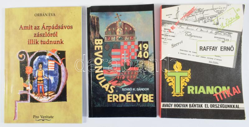 Szabó K. Sándor: Bevonulás Erdélybe 1940. Bp., 1991, B&K Kiadó. Fekete-fehér fotókkal illusztrált. Kiadói papírkötés. + Raffay Ernő: Trianon titkai, avagy hogyan bántak el országunkkal... Bp., 1990. Kiadói papírkötés. + Orbán Éva: Amit az Árpádsávos zászlóról illik tudnunk. Kiadói papírkötés, jó állapotban.