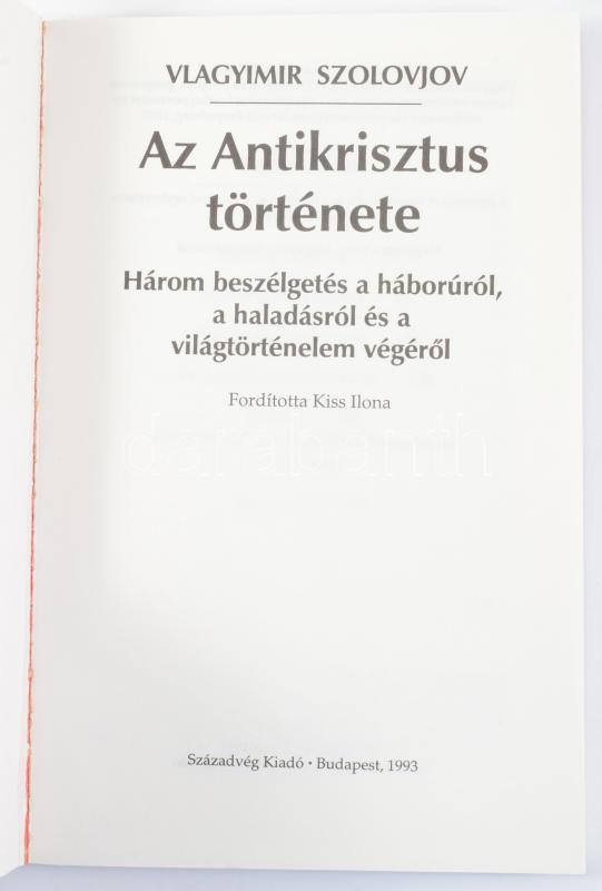 Szolovjov, Vlagyimir: Az Antikrisztus története. Három beszélgetés a háborúról, a haladásról és a világtörténelem végéről. Bp., 1993, Századvég. Kiadói papírkötés, jó állapotban.