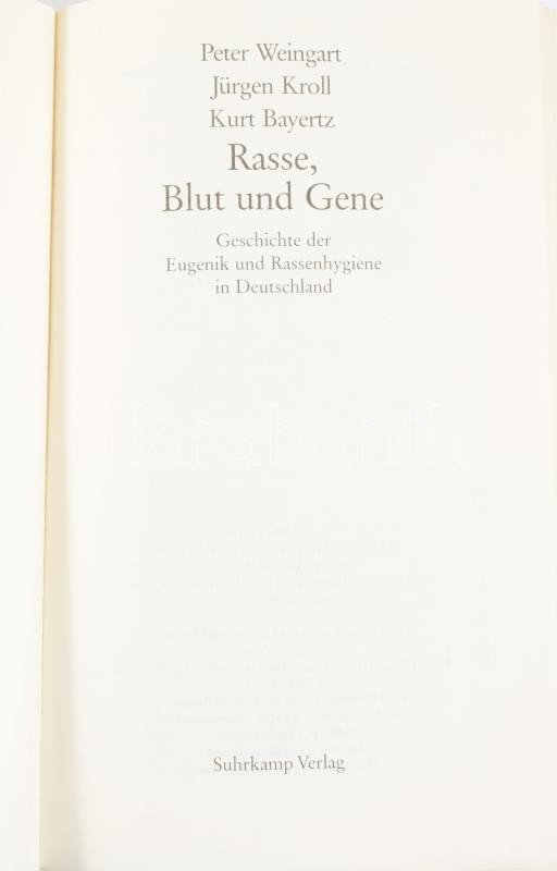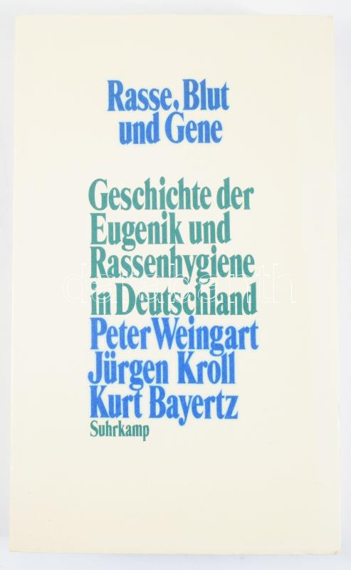 Weingart-Kroll-Bayertz: Rasse, Blut und Gene. Geschichte der Eugenik und Rassenhygiene in Deutschland. 1988, Suhrkamp Verlag. Kiadói papírkötés, jó állapotban.