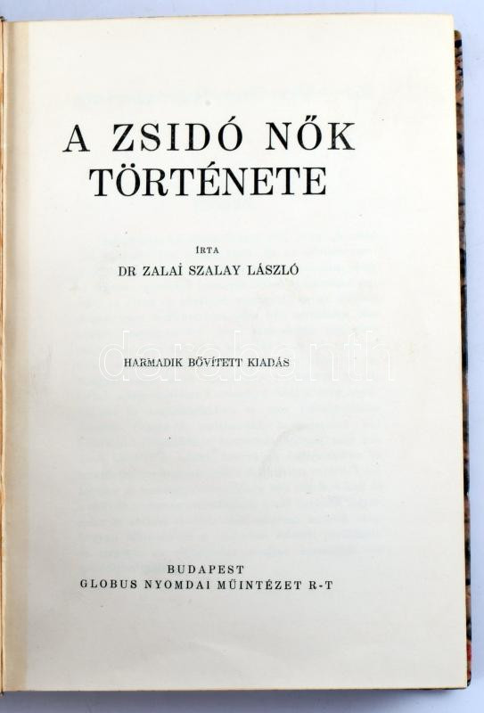Dr. zalai Szalay László: A zsidó nők története. Hevesi Simon előszavával. Bp.,é.n., Globus, 355+1 p. Harmadik, bővített kiadás.Korabeli, aranyozott félvászon-kötés, eredeti papírborító bekötve, jó állapotban